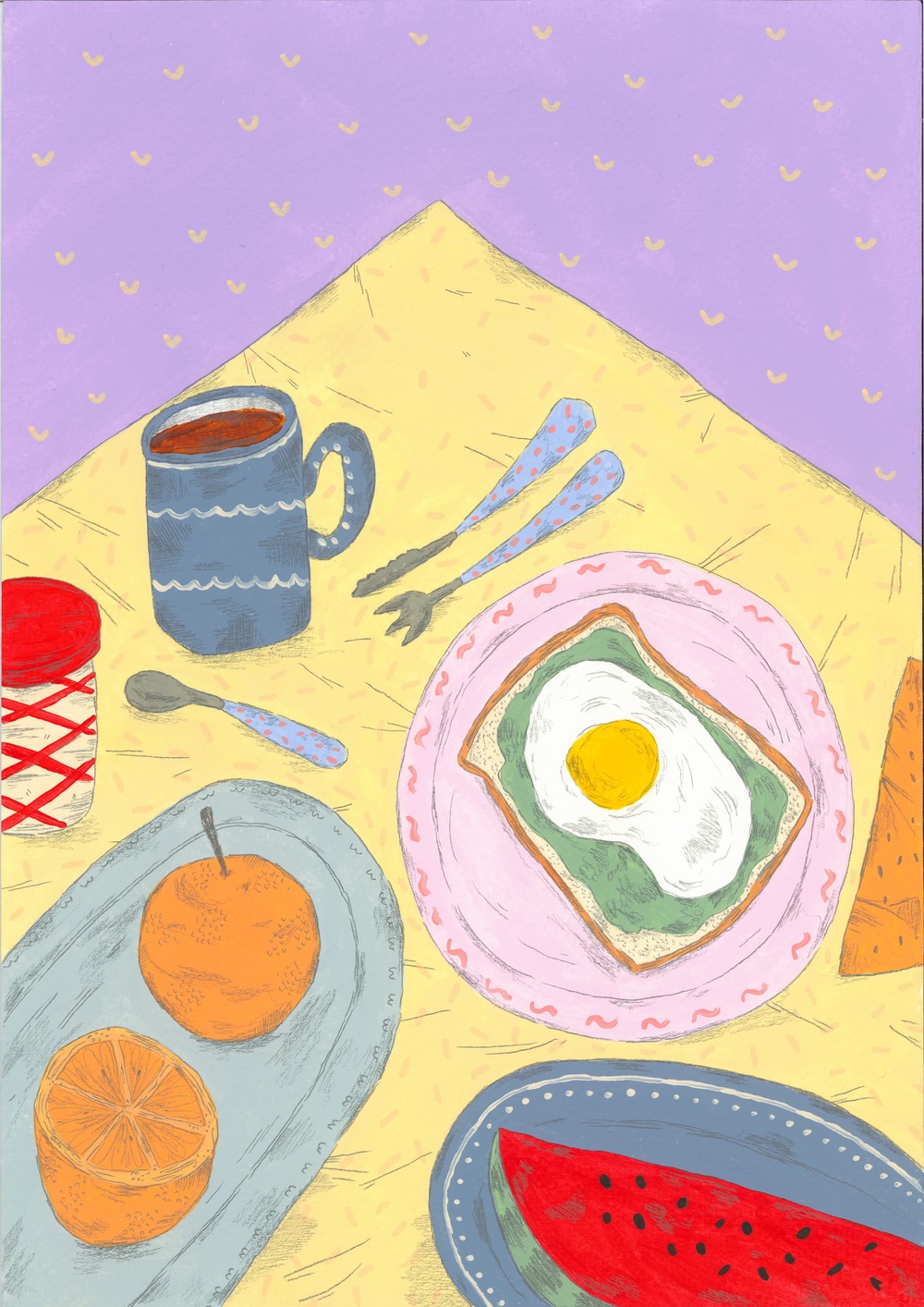 • Ilustração de pequeno-almoço com ovo, pão, frutas e caneca sobre mesa amarela e parede lilás.