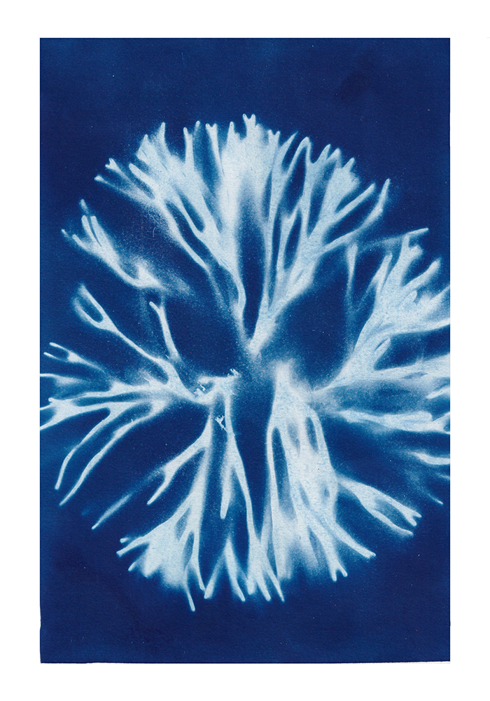 A cianotipia é uma técnica alternativa e ecológica, impressa por elementos naturais – o sol e a água. São resultado de uma pesquisa local, que retrata a flora marítima e veraneia. impressa ao ritmo das ondas. Os desenhos aliam-se aos fotogramas e exploram relações entre as sombras desenhadas e fotografadas. Vamos molhar os pés?