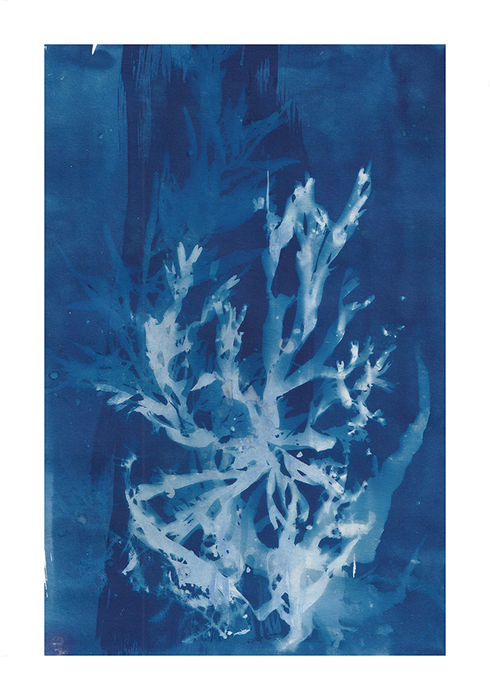 A cianotipia é uma técnica alternativa e ecológica, impressa por elementos naturais – o sol e a água. São resultado de uma pesquisa local, que retrata a flora marítima e veraneia. impressa ao ritmo das ondas. Os desenhos aliam-se aos fotogramas e exploram relações entre as sombras desenhadas e fotografadas. Vamos molhar os pés?