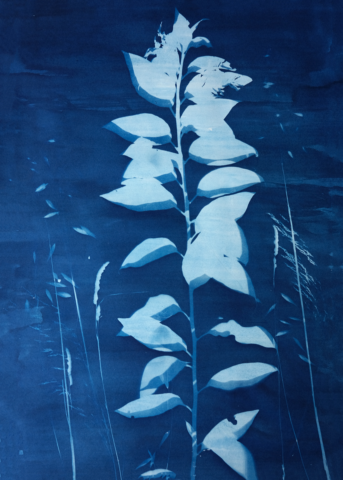 A cianotipia é uma técnica alternativa e ecológica, impressa por elementos naturais – o sol e a água. São resultado de uma pesquisa local, que retrata a flora marítima e veraneia. impressa ao ritmo das ondas. Os desenhos aliam-se aos fotogramas e exploram relações entre as sombras desenhadas e fotografadas. Vamos molhar os pés?