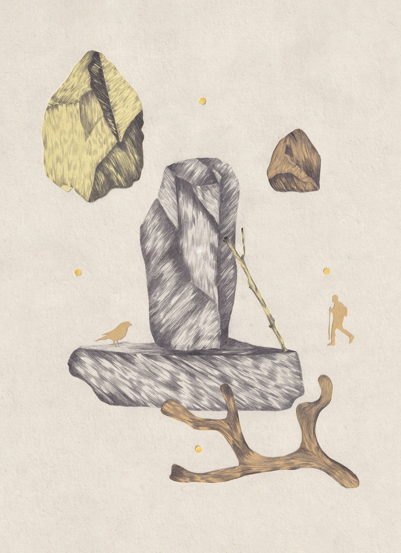 Desenho de pedras cinzentas e castanhas, pássaro, caminhante e galhos sobre fundo bege