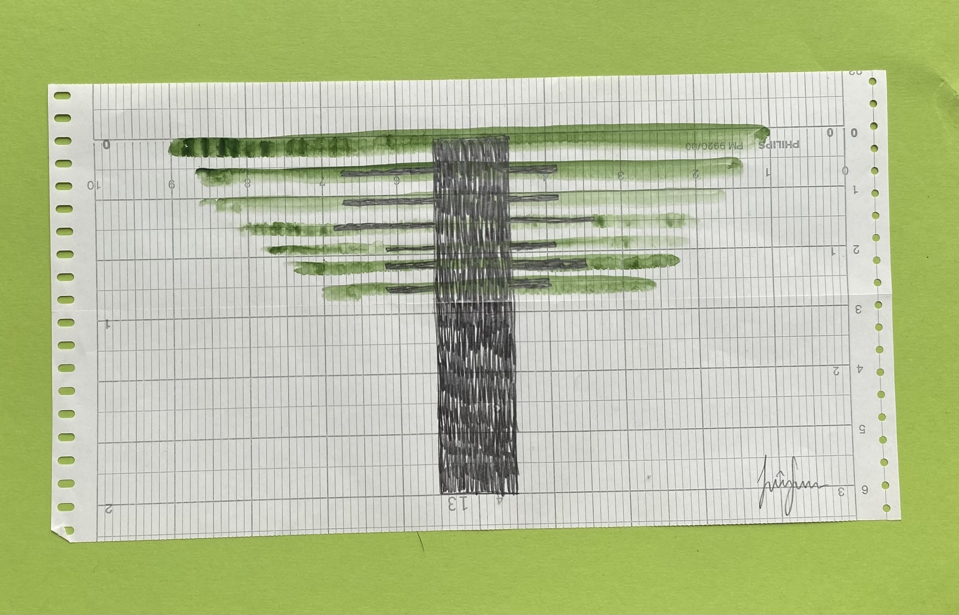 • Desenho em folha quadriculada com padrões verdes e pretos sobre fundo verde