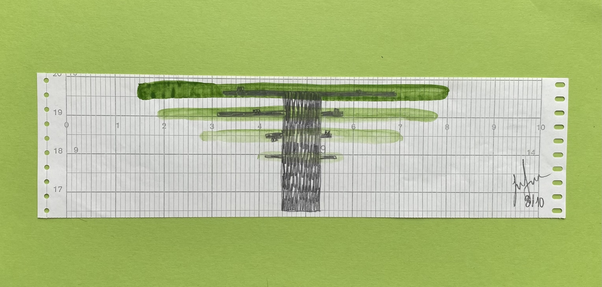 • Papel contínuo com gráfico desenhado e assinaturas sobre fundo verde
