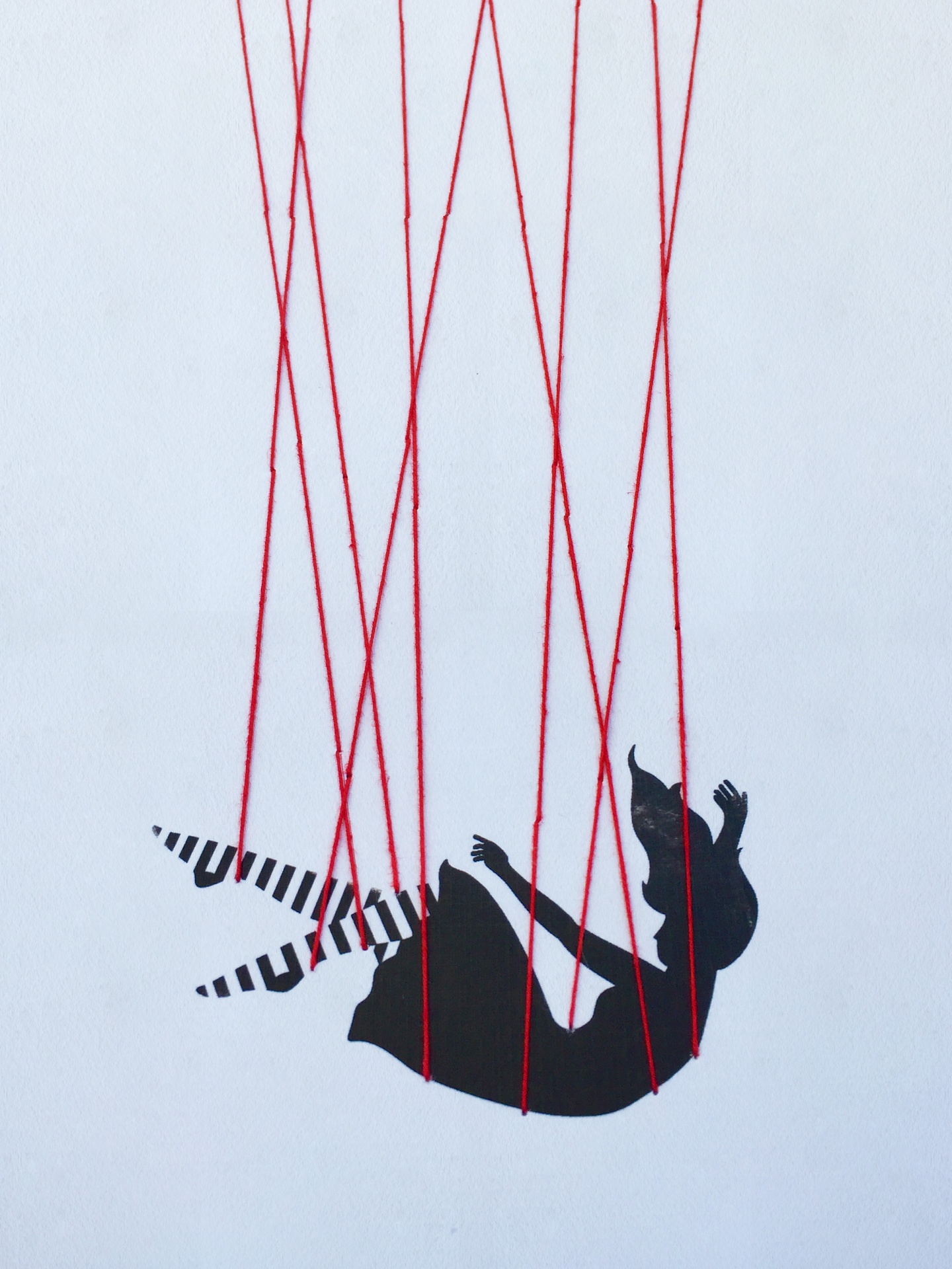 • Pintura mural de figura humana suspensa por fios vermelhos