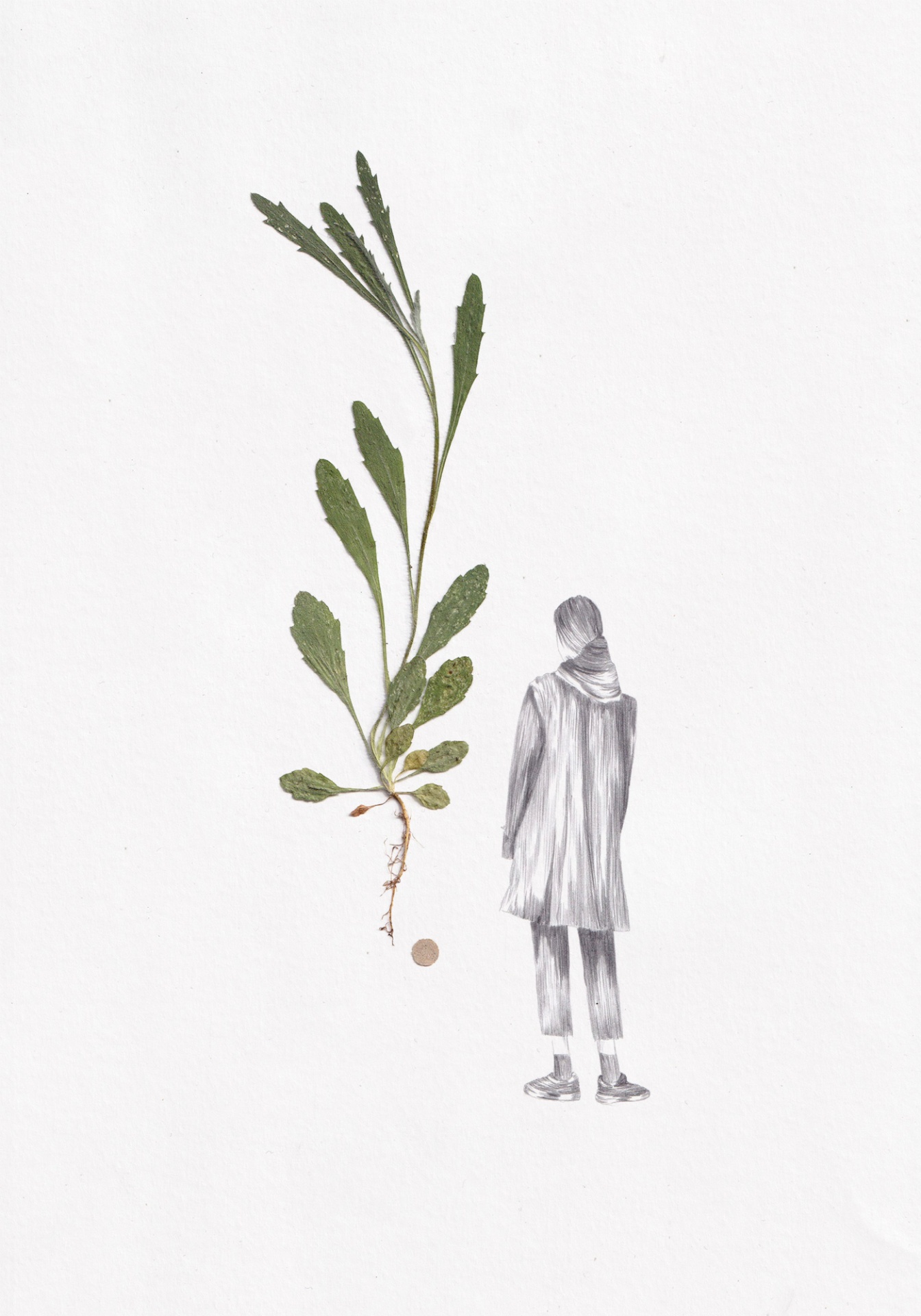 Planta verde com raiz ao lado de desenho a lápis de pessoa de costas em fundo branco