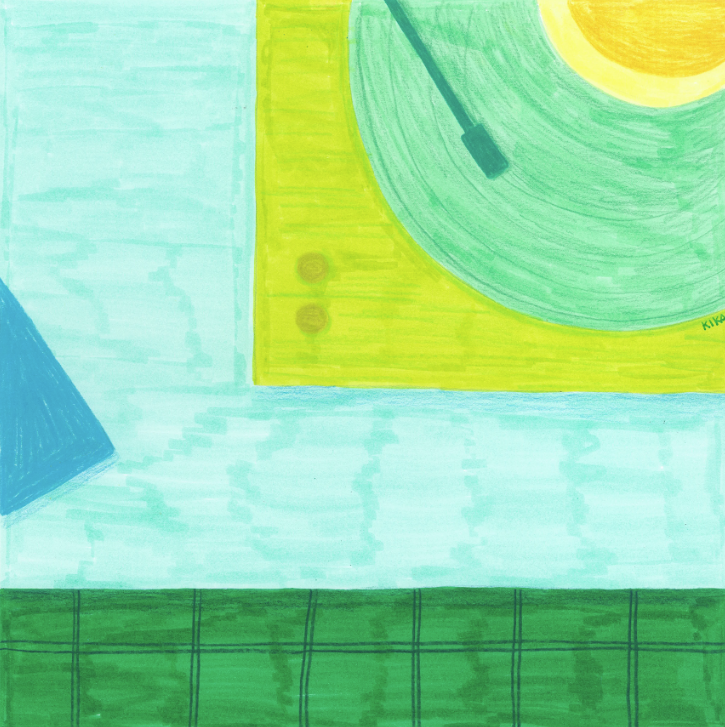 • Desenho abstrato com objetos em tons de verde, amarelo e azul