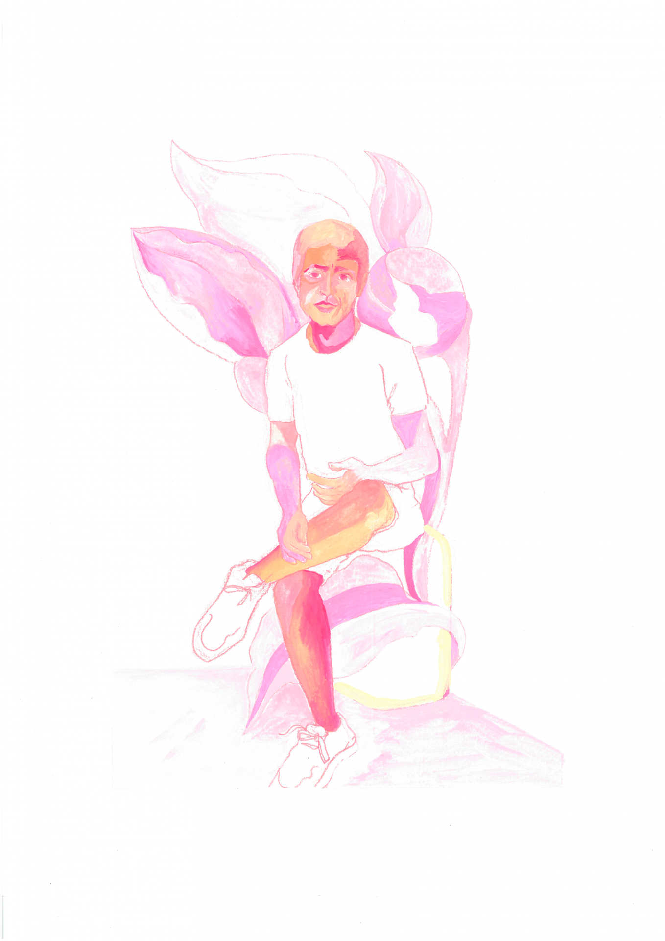 • Desenho de pessoa com roupa branca sentada com fundo floral rosa.