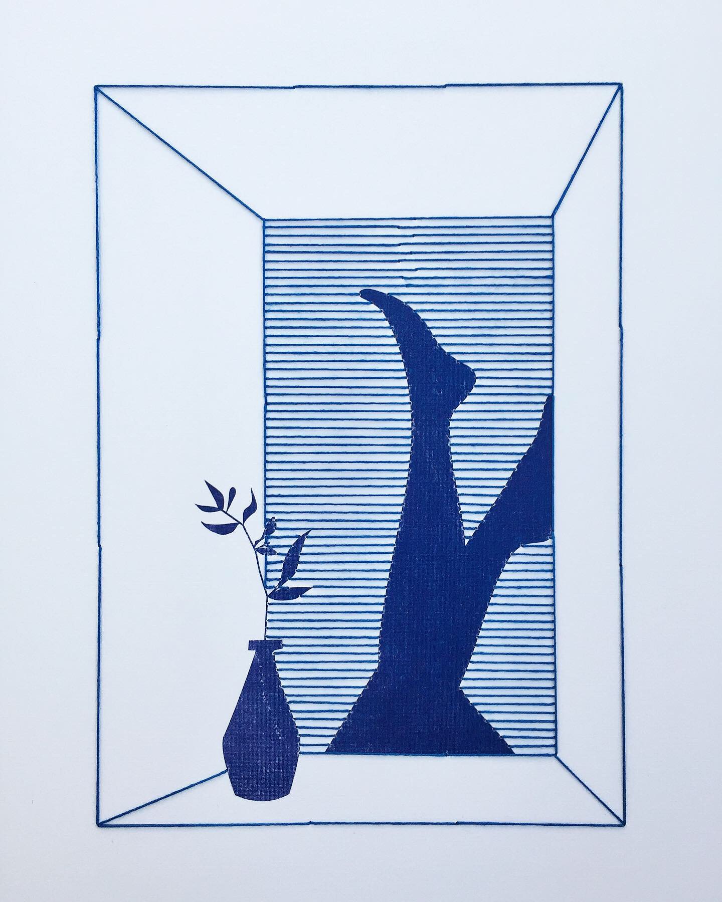 • Ilustração abstrata azul e branca com vaso e silhueta de perna em moldura retangular