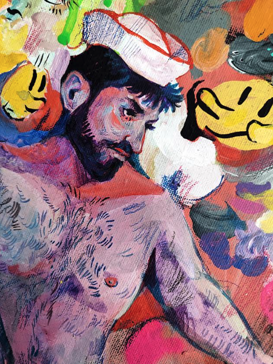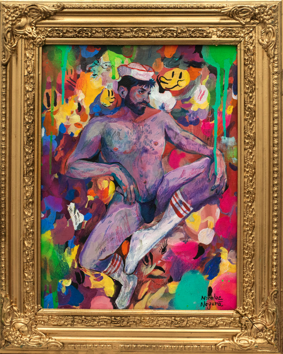 • Pintura colorida de homem nu com boné, meias com riscas, fundo abstrato colorido, moldura dourada ornamentada