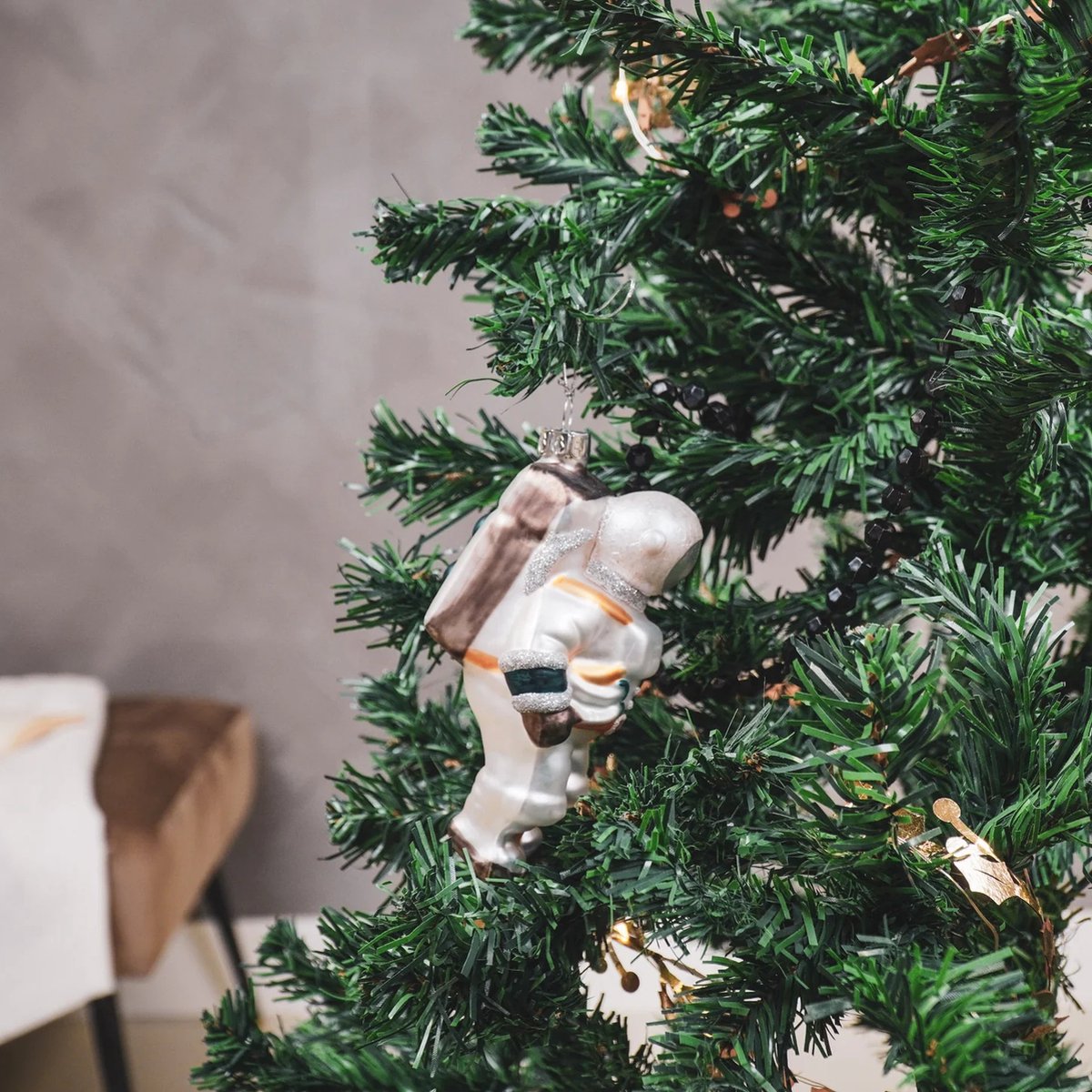 • Enfeite de astronauta pendurado em árvore de Natal artificial verde