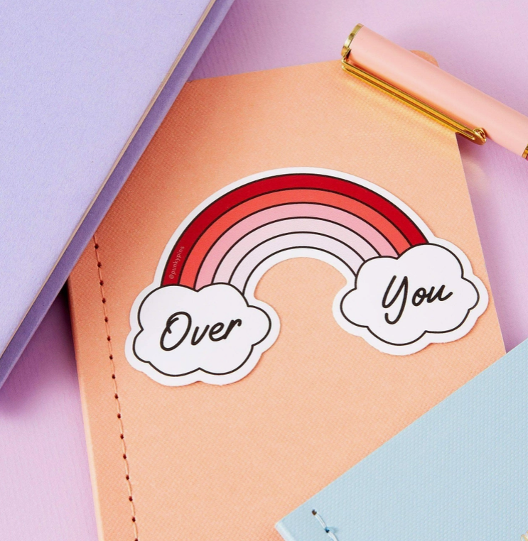 • Adesivo de arco-íris vermelho e rosa com texto 'Over You' em nuvens, sobre caderno cor-de-rosa claro, perto de cadernos lilás e azul claro e caneta cor-de-rosa