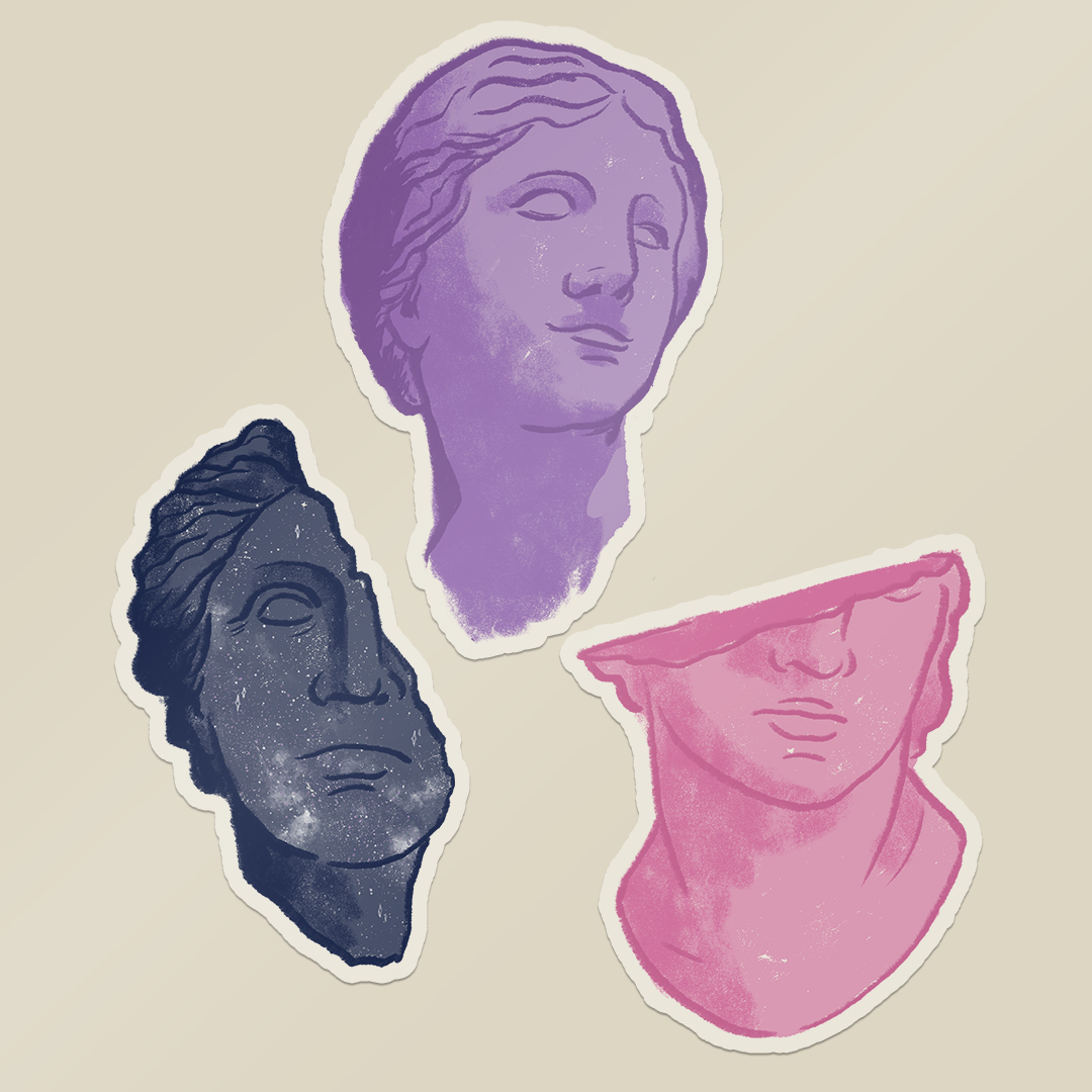 • Três adesivos de rostos de estátuas clássicas em roxo, azul escuro com estrelas e rosa, fundo bege.