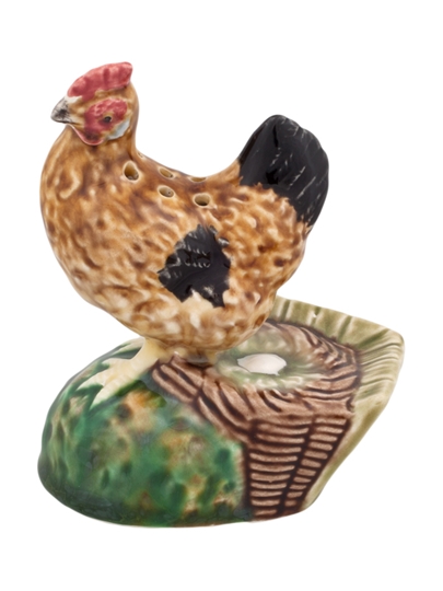 • Tempero cerâmico em forma de galinha castanha com base verde e castanha