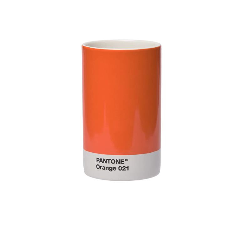 • Copo cilíndrico cerâmico laranja com base branca e texto Pantone Orange 021
