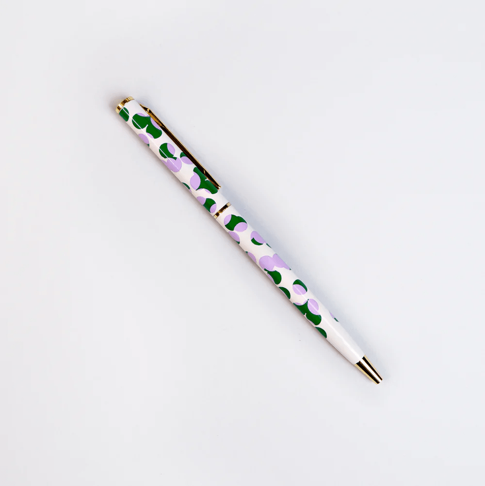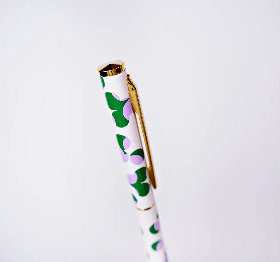 • Caneta esferográfica com padrão de folhas verdes e lilás e clip dourado