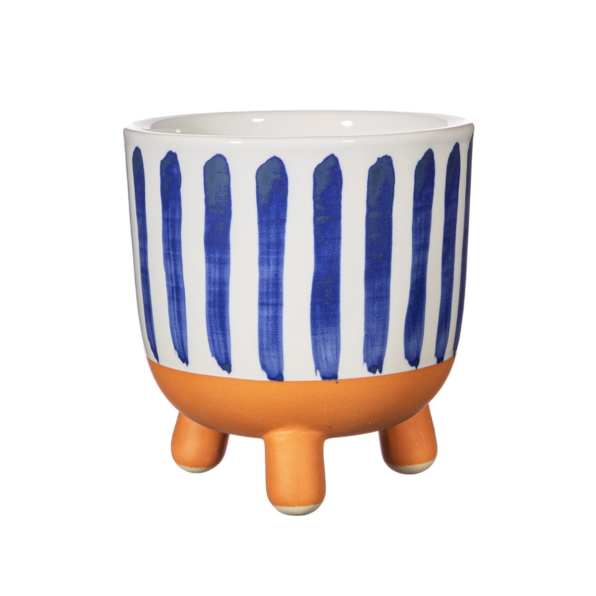 • Vaso de cerâmica branco e terracota com riscas azuis e três pés