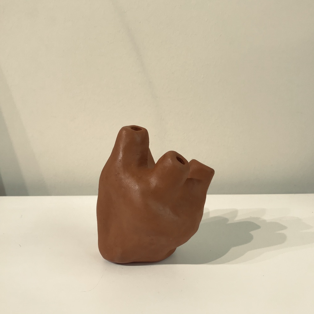 Peças moldadas manualmente em diferentes tipos de barro (branco, vermelho e refratário) cozidas em mufla e posteriormente vidradas. Medidas aprox: 14 cm de altura e 10 de largura.