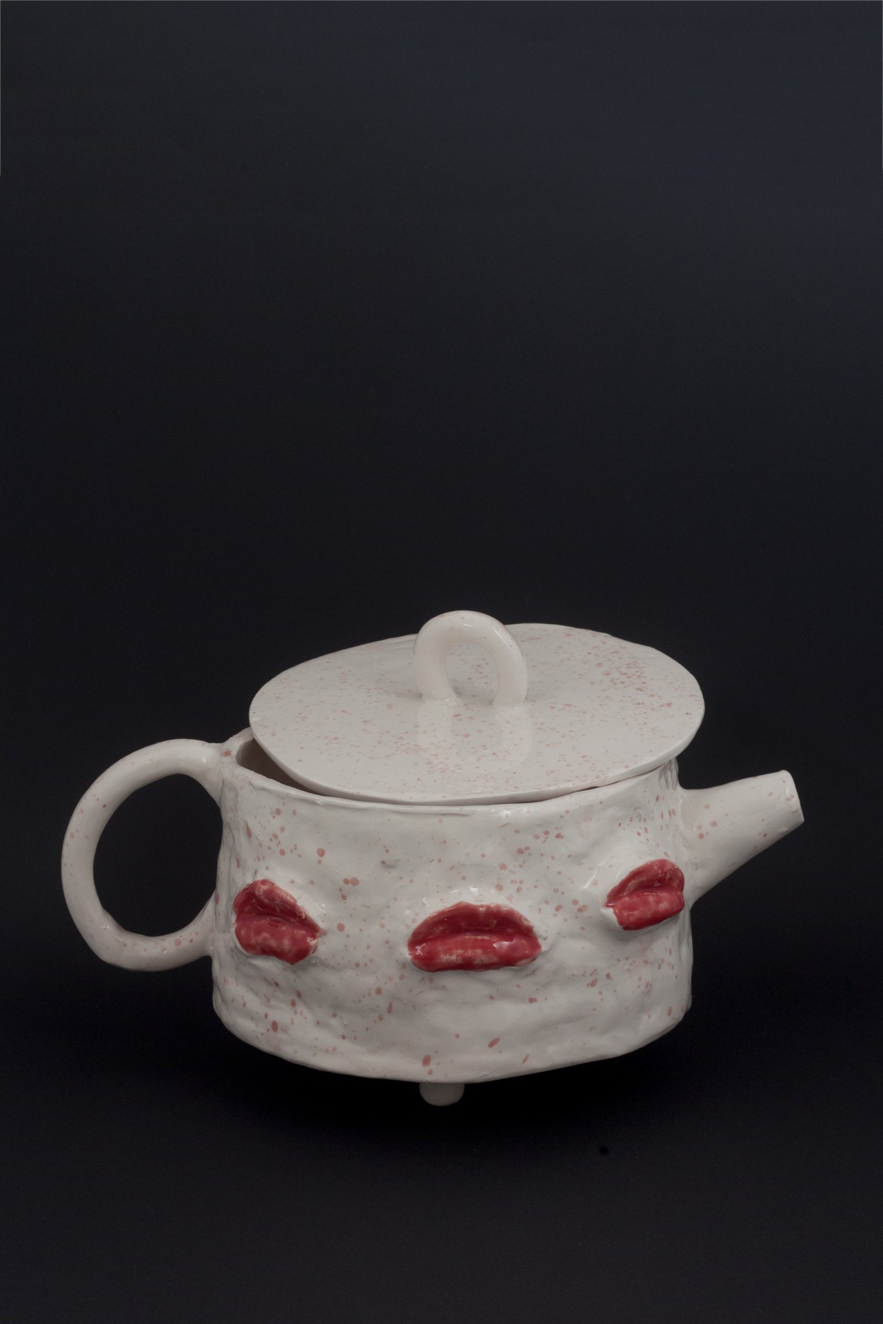 Bule para chá com três pés e 6 bocas decorativas. Corpo feito através da técnica do rolinho e/ou laje e bocas feitas através de moldes da própria boca.