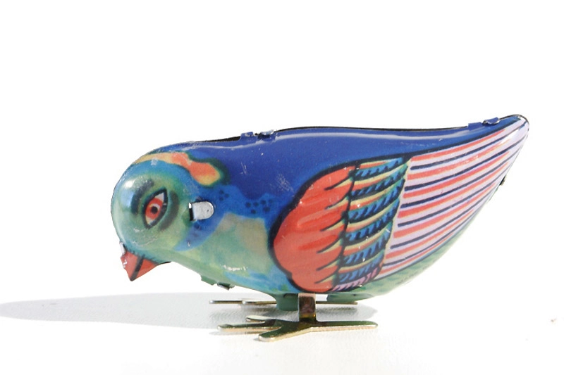 • Brinquedo de lata em forma de pássaro colorido com base metálica