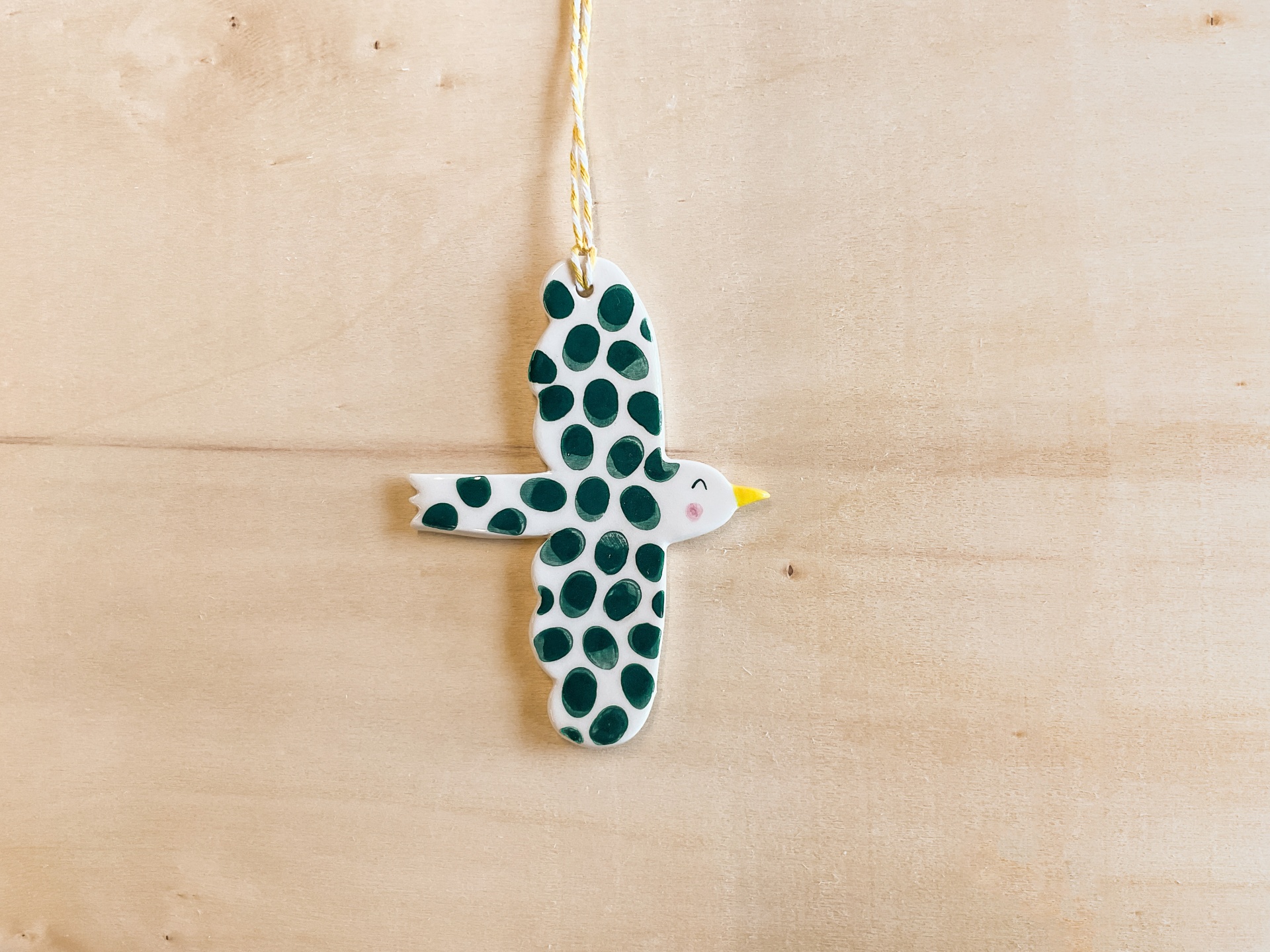 • Móbile de pássaro em cerâmica branca e verde suspenso por fio sobre madeira clara