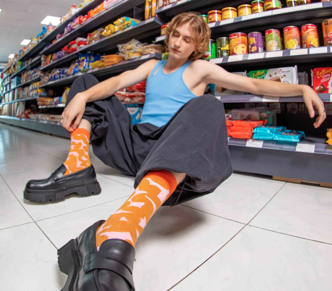 • Pessoa sentada no chão de loja com roupa e meias coloridas, prateleiras de alimentos ao fundo.