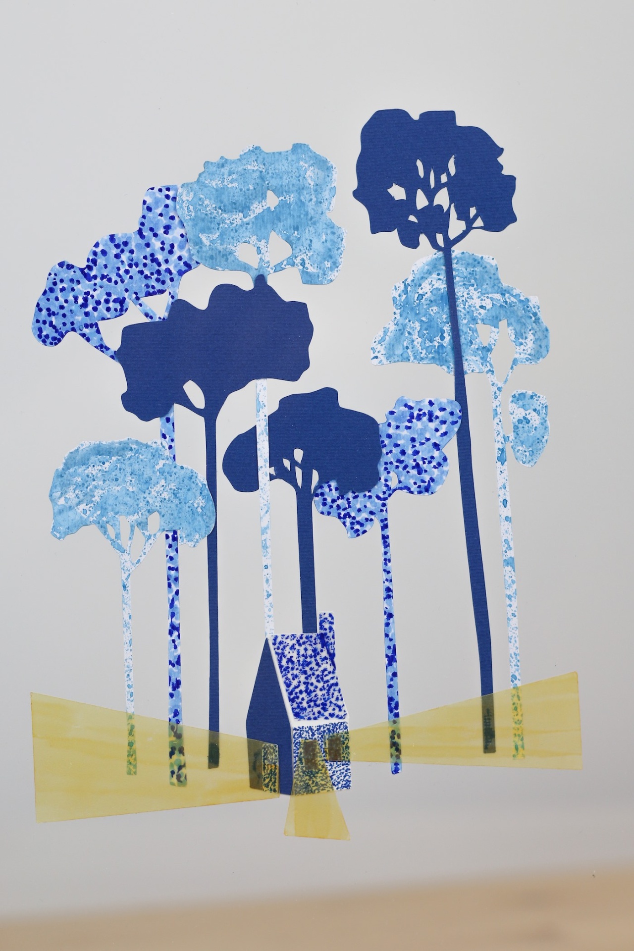 • Ilustração de árvores azuis e pequena casa azul com fundo cinza claro