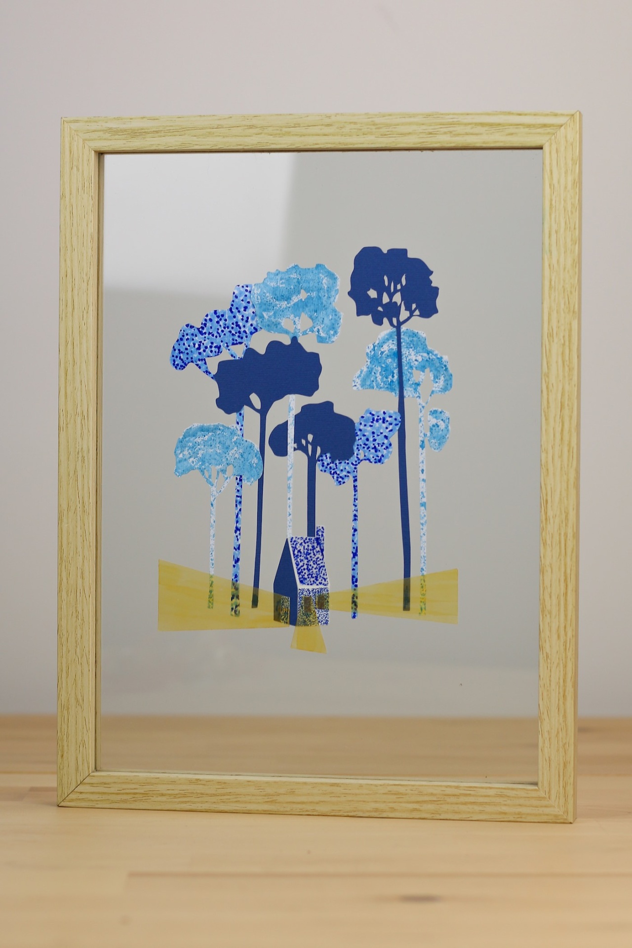 • quadro de madeira com ilustração de árvores e casa azul