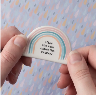 Objeto decorativo em forma de arco-íris com texto sobre fundo estampado de gotas de chuva
