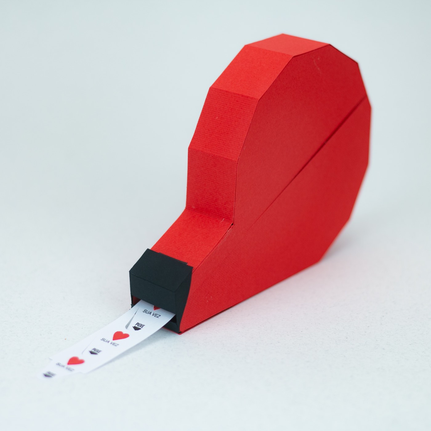 • Objeto de papel vermelho com tira branca a sair da extremidade preta