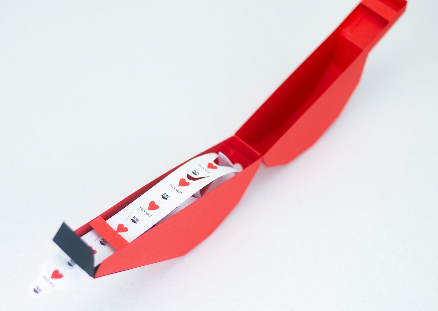 • Caixa vermelha aberta com tiras de papel com corações vermelhos e texto