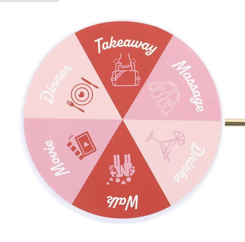 O design apresenta um pêndulo esférico em tom dourado e seis possíveis resultados: 'Caminhada', 'Filme', 'Jantar', 'Takeaway', 'Massagem' e 'Bebidas' numa paleta de cores rosa e vermelho.