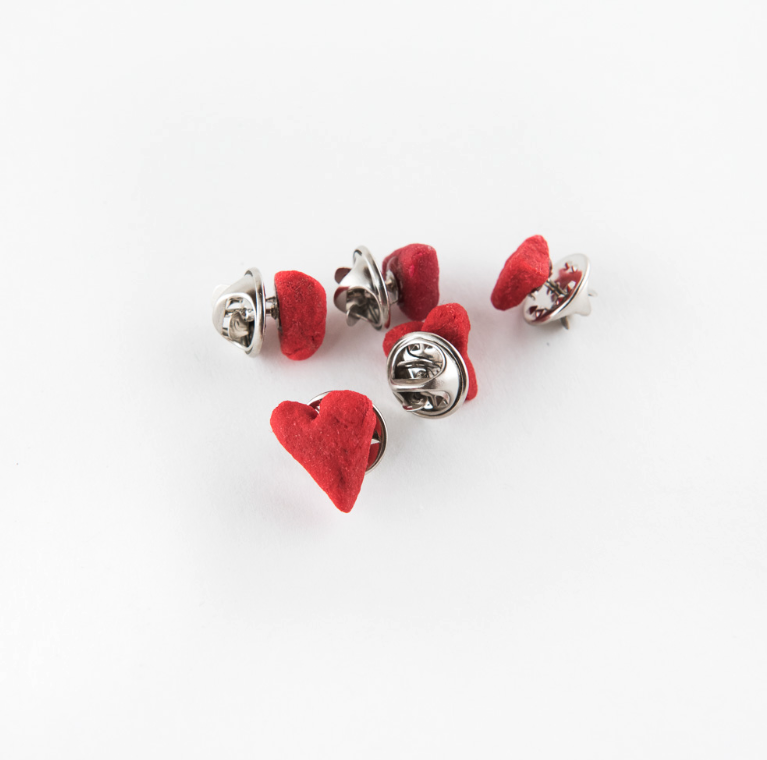 • botões metálicos com pincas e corações vermelhos de tecido aveludado