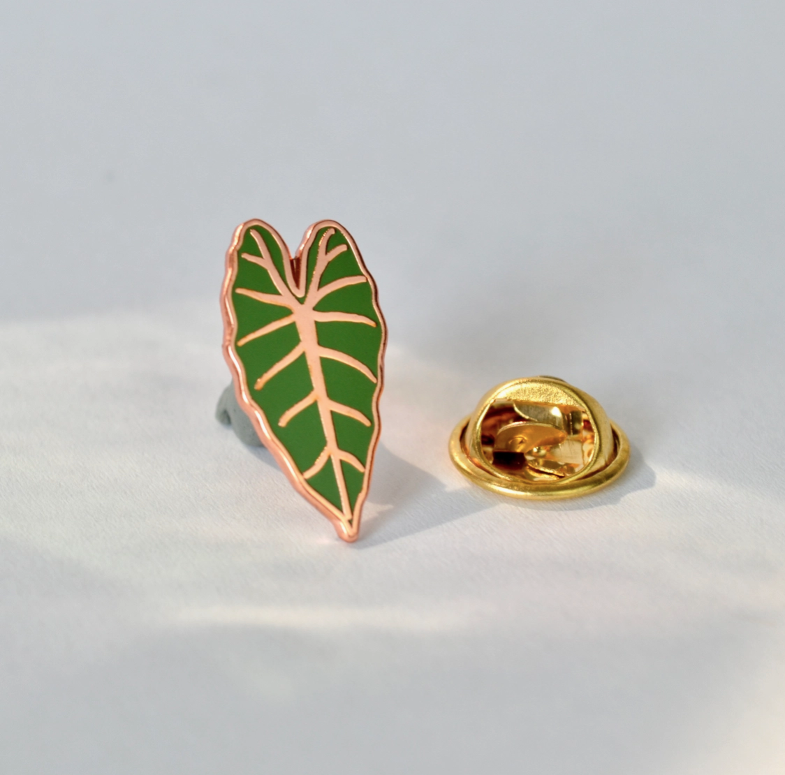• Alfinete de lapela em forma de folha verde com veias cor de rosa e fecho dourado