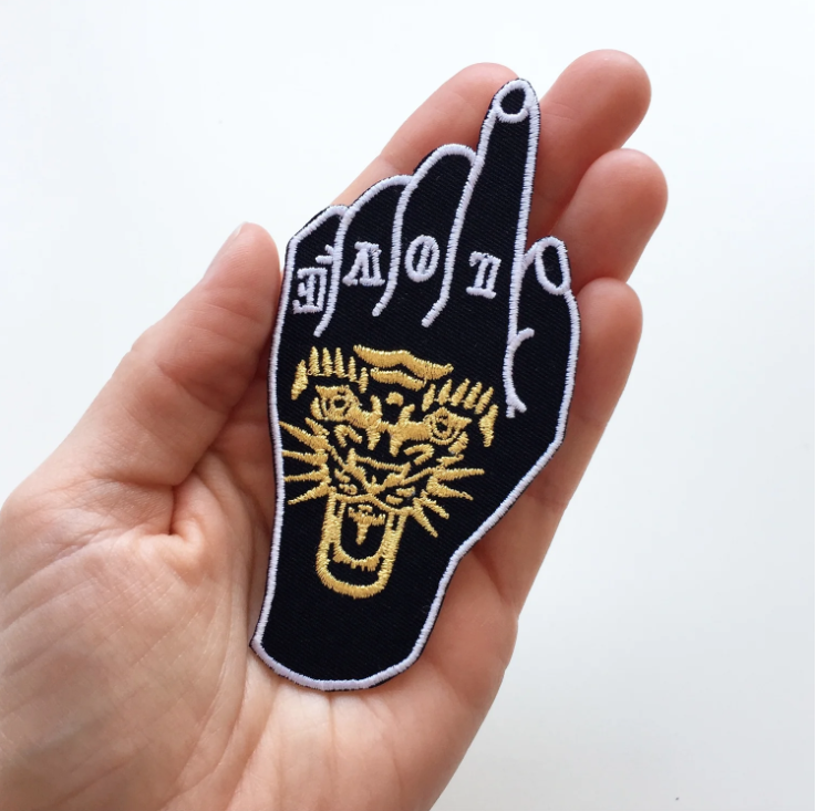 • Patch bordado em forma de mão com dedo médio levantado, palavras 'LOVE' e cabeça de tigre dourada
