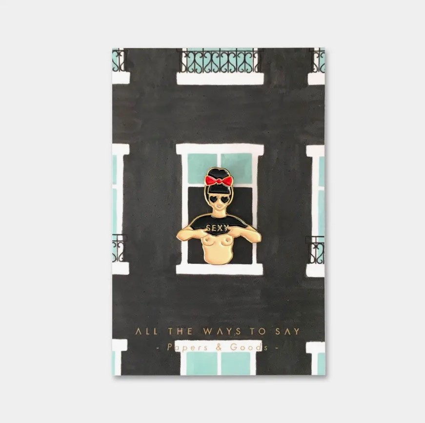 • Pin dourado de mulher com t-shirt SEXY em fachada preta com janelas azuis