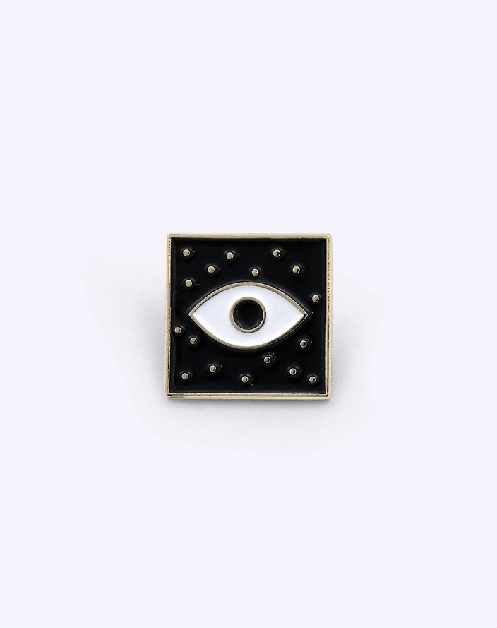 Pino quadrado preto com desenho de olho branco no centro