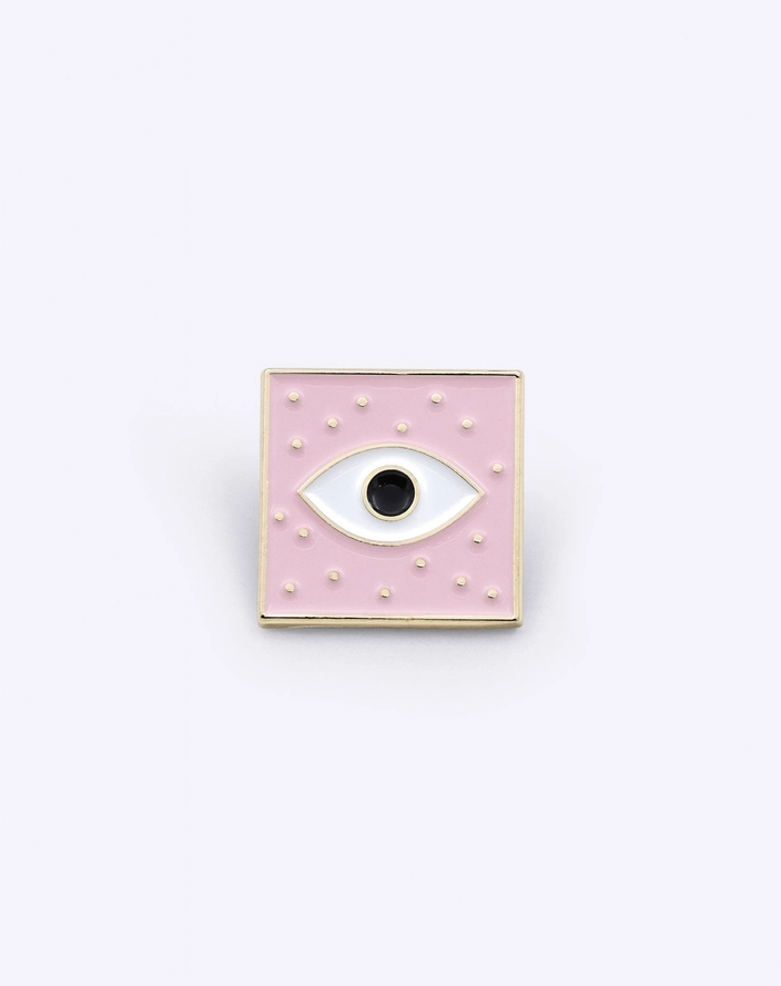 • Broche quadrado rosa com desenho de olho branco e pupila preta