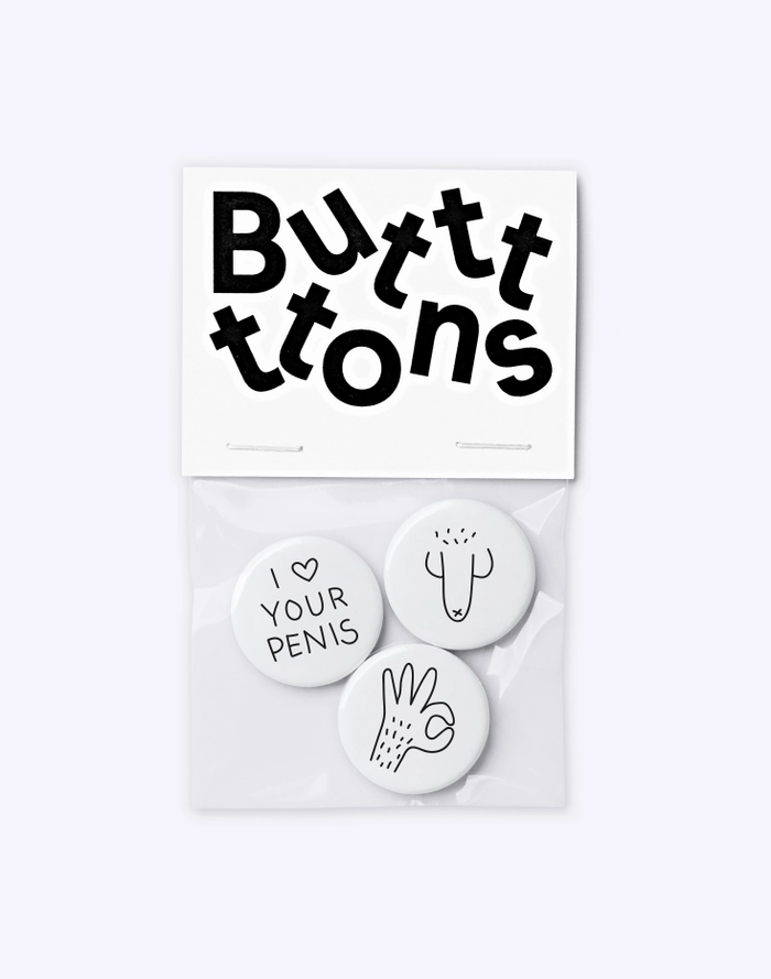 • Três botões redondos metálicos brancos com desenhos e texto preto em embalagem de plástico