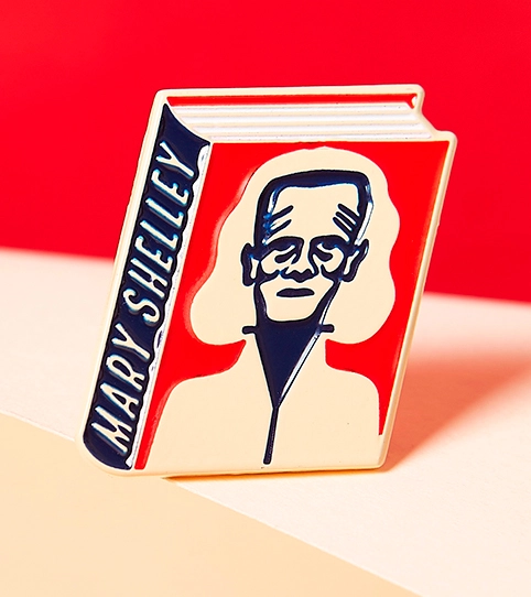• Alfinete em forma de livro Mary Shelley em cartão branco com texto