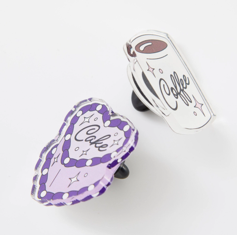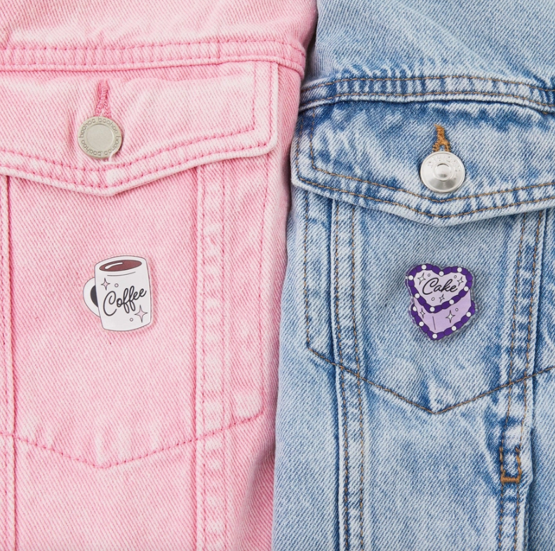 • Dois pins acrílicos, um fatia de bolo roxa com texto Cake e uma caneca branca com texto Coffee