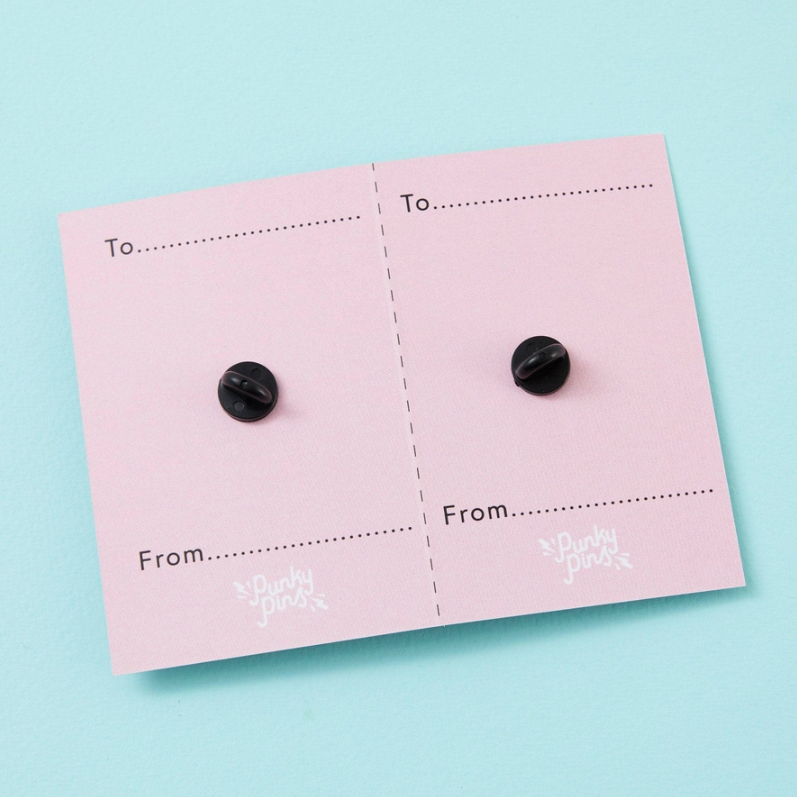 • Dois alfinetes pretos em cartão cor-de-rosa com texto To e From