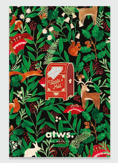 • Padrão festivo com caixa de correio vermelha Santa's Mail e vários animais e plantas sobre fundo preto