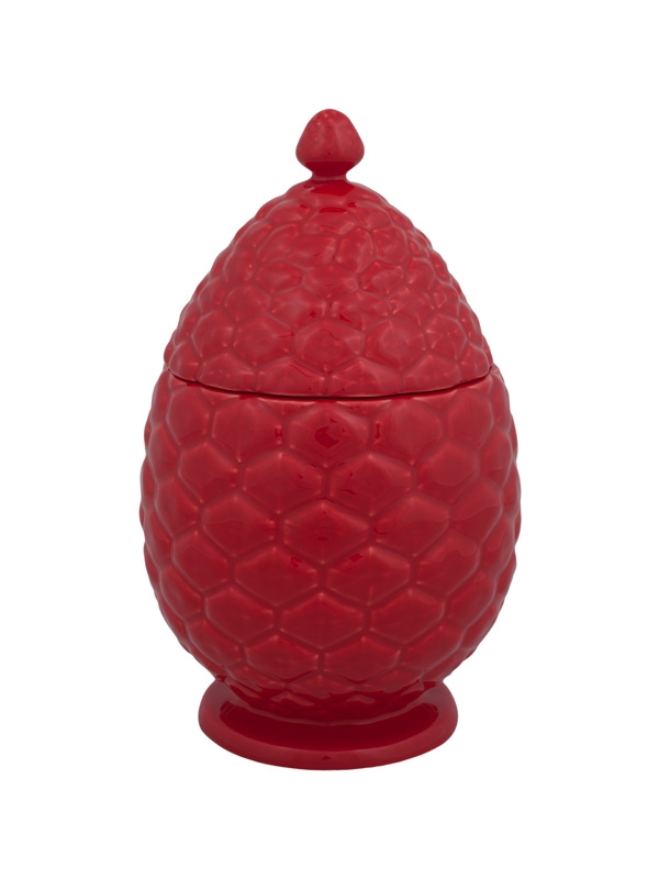 • Pote vermelho em cerâmica com textura de pinha e tampa com pega arredondada