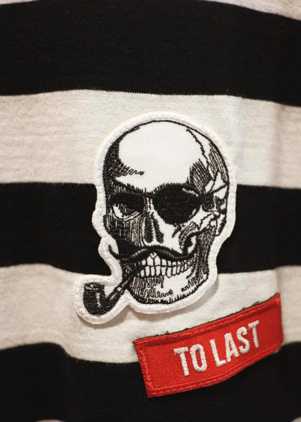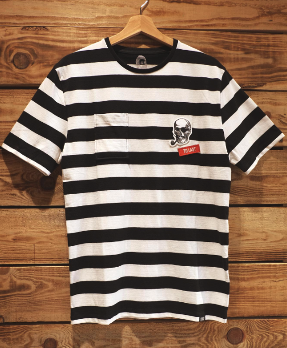 Black and white stripes t-shirt with “skull” and “to last” patch.