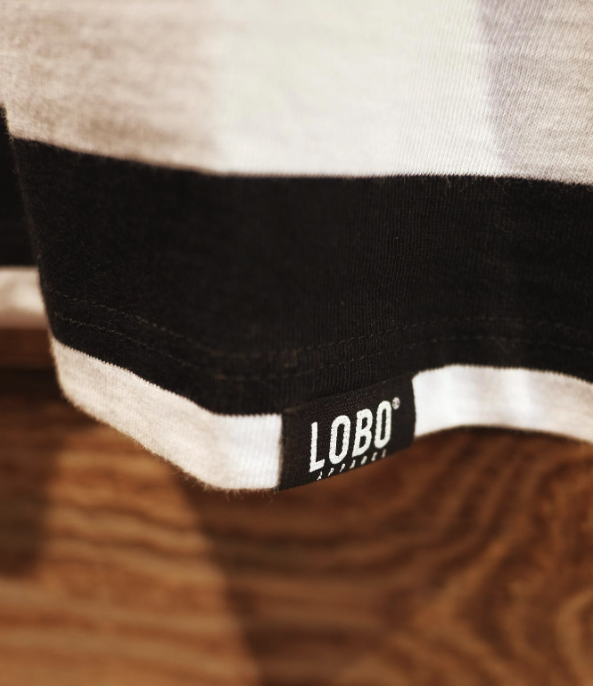 • Bainha inferior de roupa listrada preta e branca com etiqueta 'LOBO'.