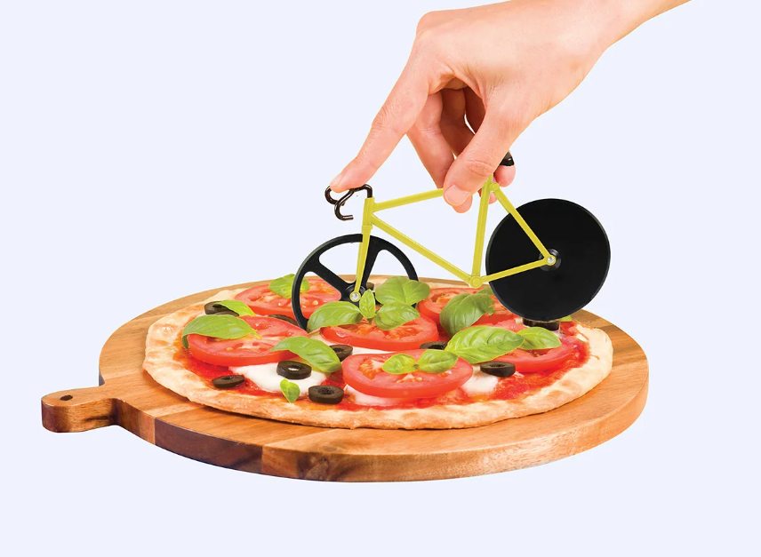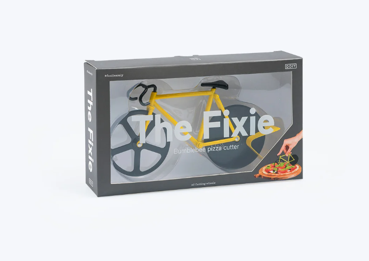 Unique pizza cutter shaped as a fancy fixie bike. Its double cutting wheels system makes it easy to slice your pizza. It includes a stand to convert this quirk object in a decorative piece in your kitchen. This model is inspired by the colours of bumblebees.