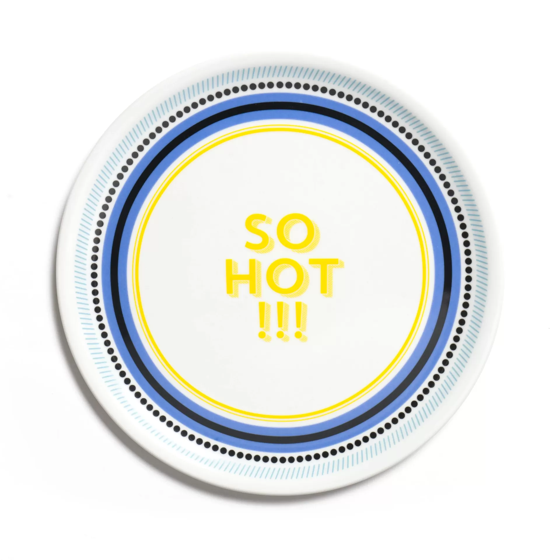Prato descartável branco com texto SO HOT !!! e círculos azuis e pretos.