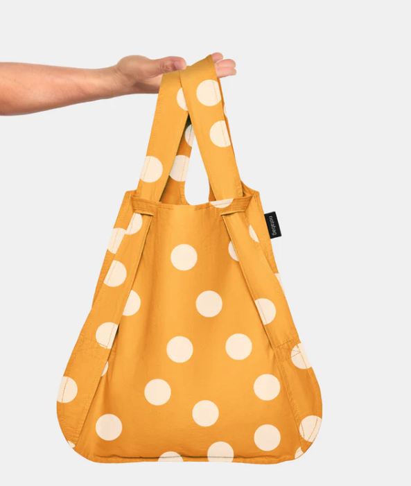 • Saco amarelo com bolinhas brancas e alças largas
