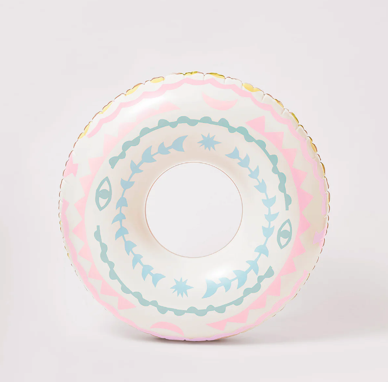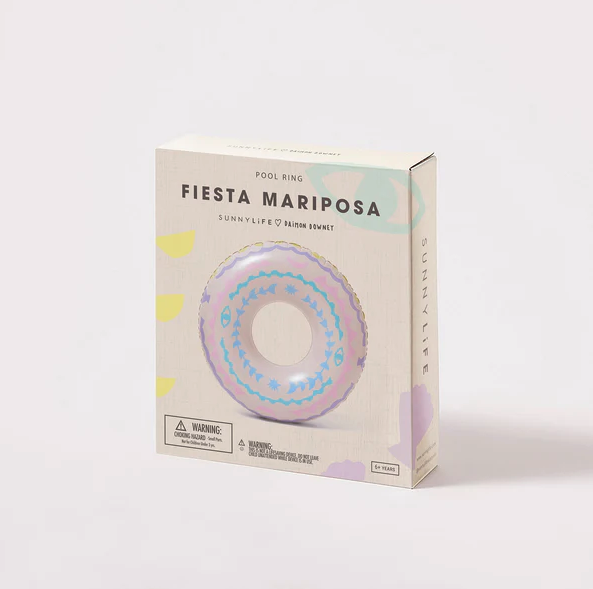 FLOAT TO PARADISE The Fiesta Mariposa Pool Ring will bring a pop of colour to your life this summer. With a fresh colour scheme of white and rainbow colours, plus a retro paper cut-out print, the Fiesta Mariposa Pool Ring will instantly transport you to sun kissed days of celebration. The Fiesta Mariposa Pool Ring also features exclusive artwork from the limited edition SUNNYLiFE X Daimon Downey artist collaboration. It's the perfect accessory for expressing your creative side and elevating your summer aesthetic.