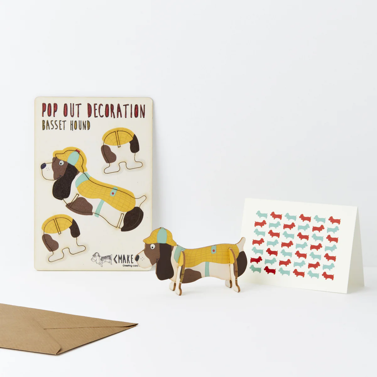 Accompanied by: an A7 greeting card with repeat Basset Hound pattern (left blank for your own message) and a brown A6 envelope.